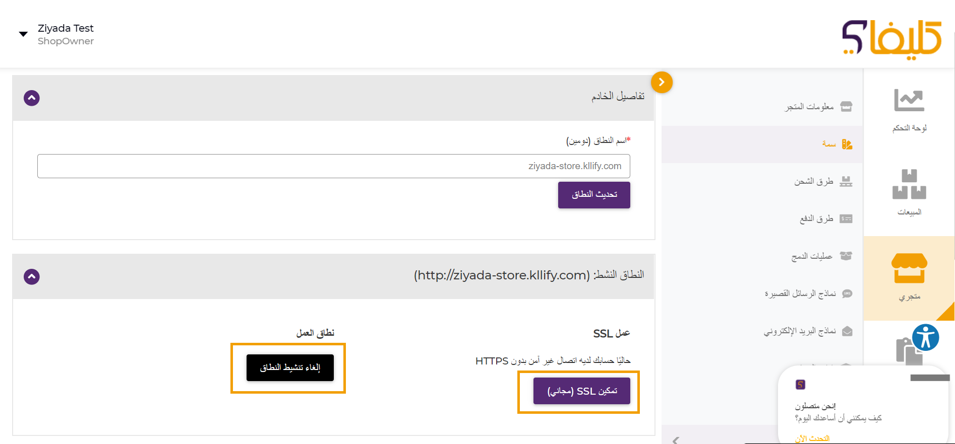 - وحالياً أيضا حسابك لدية إتصال غير آمن بدون HTTPS ،لتفعيل الإتصال الأمن إنقر على أيقونة "تمكين SSL (مجاني)"